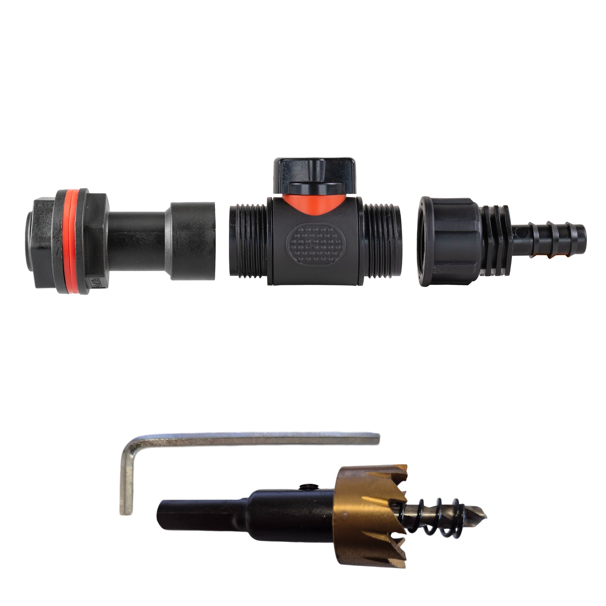 - Kit contains: 1 x Water Butt Extension ¾” BSP (EXTENSION34BSPM-F), 1 x Nut (BUTT34BSPM-NUT), 2 x Washers (BUTT34BSPM-WASHER), 1 x In-Line Valve ¾” BSP (HCV34BSPM001BLACK), 1 x Joiner for ½” Pipe with ¾” BSP Thread (STR16B34BSPF), 1 x 27mm HSS Drill Bit Hole Saw Cutter (DB27MM)